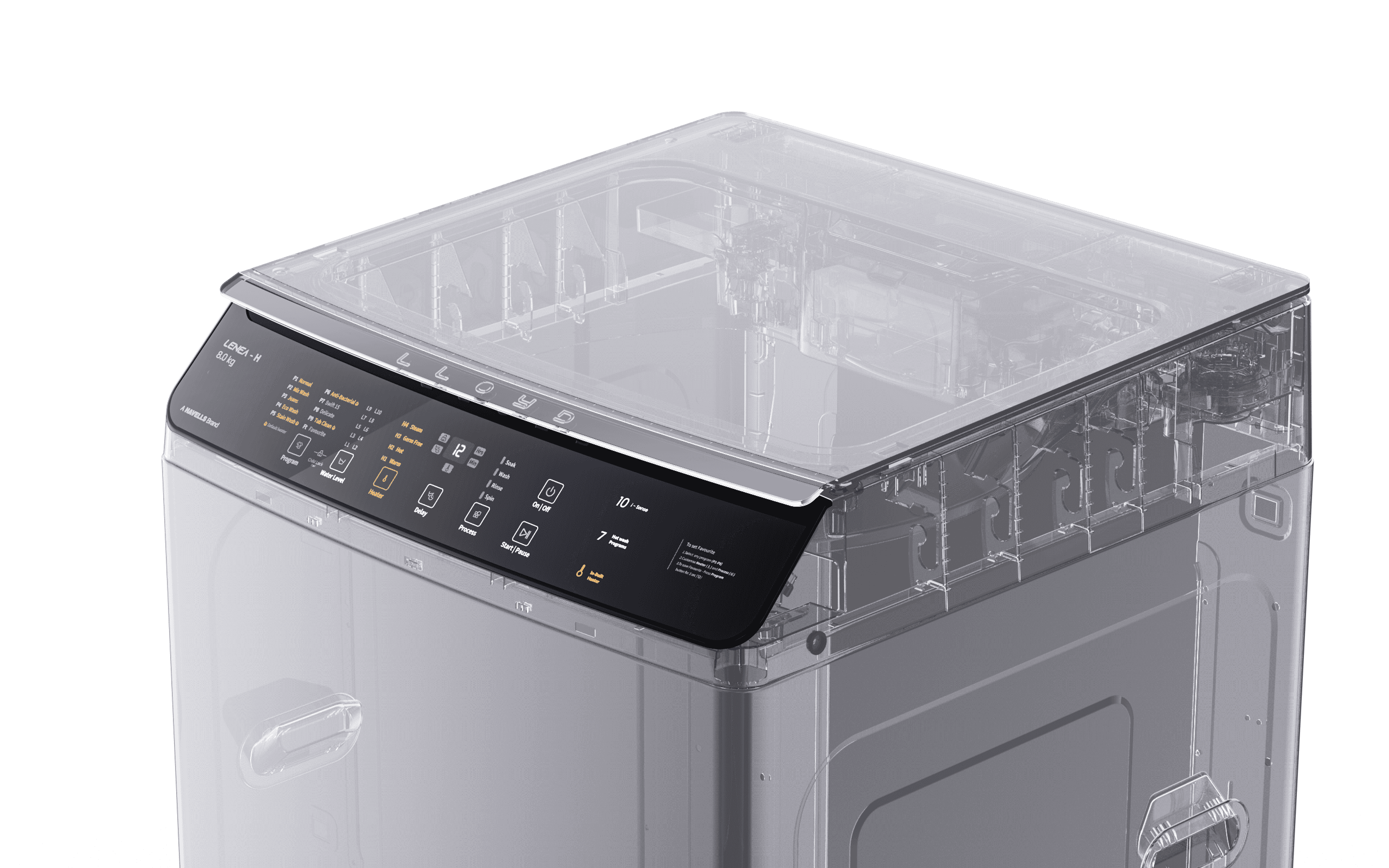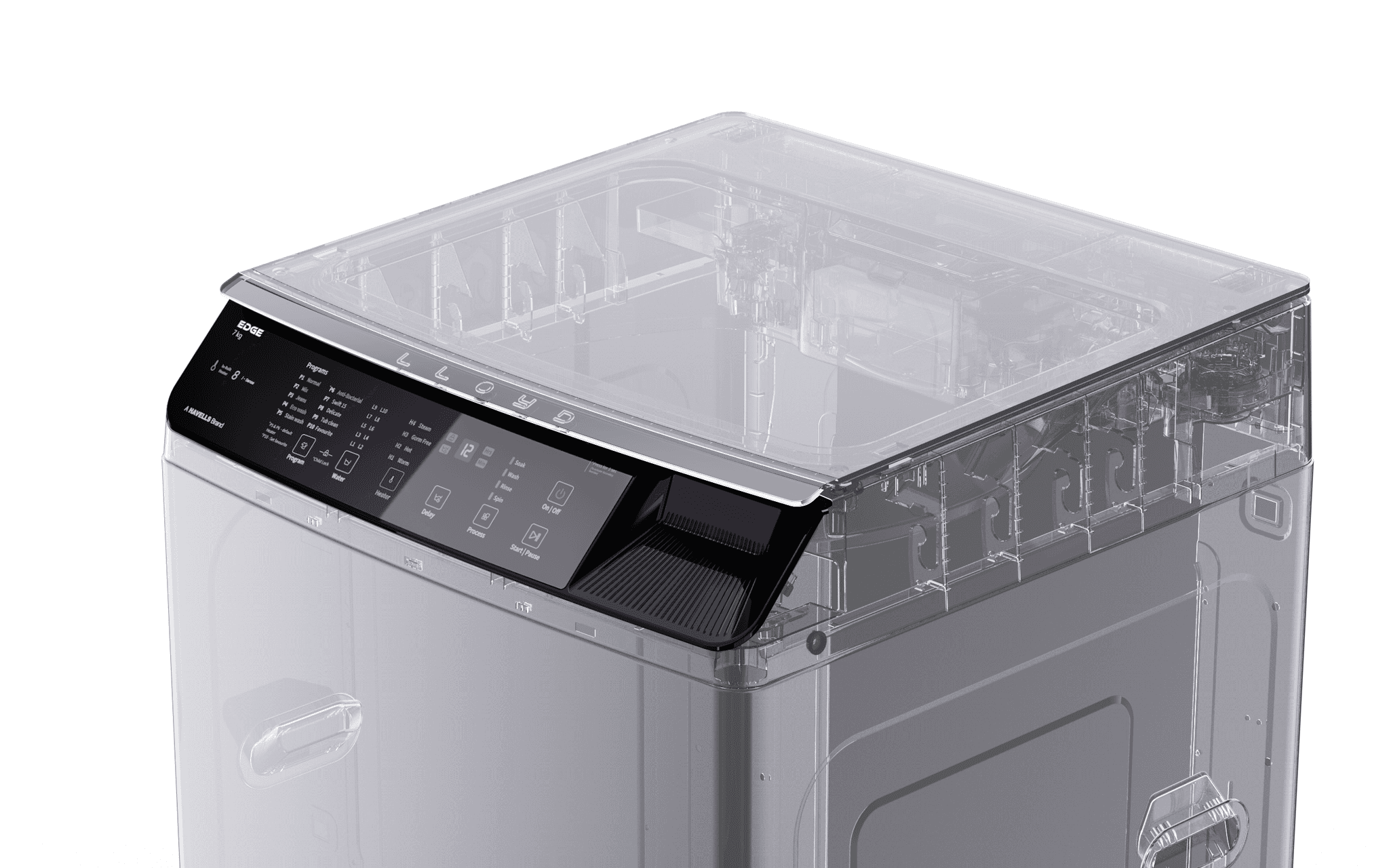 Clean aesthetics, largest glass top lid, tilting ergonomic control panel, stylized asymmetrically placed pocket handle for a unique look, celebrated chrome-lined lid trim, consumer facing unique detergent pocket.